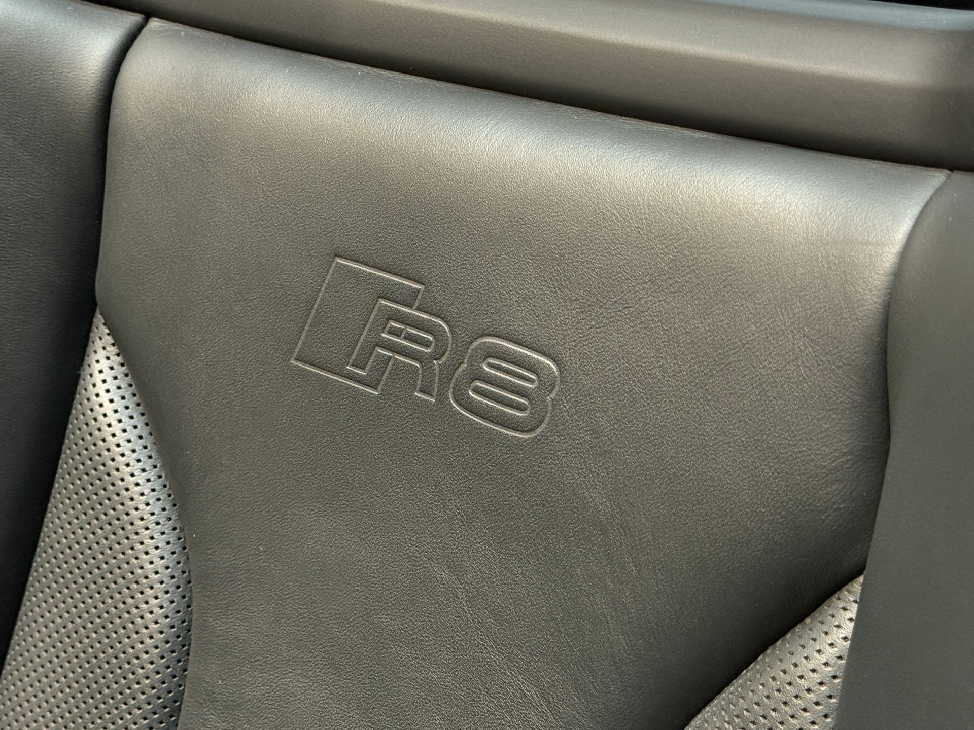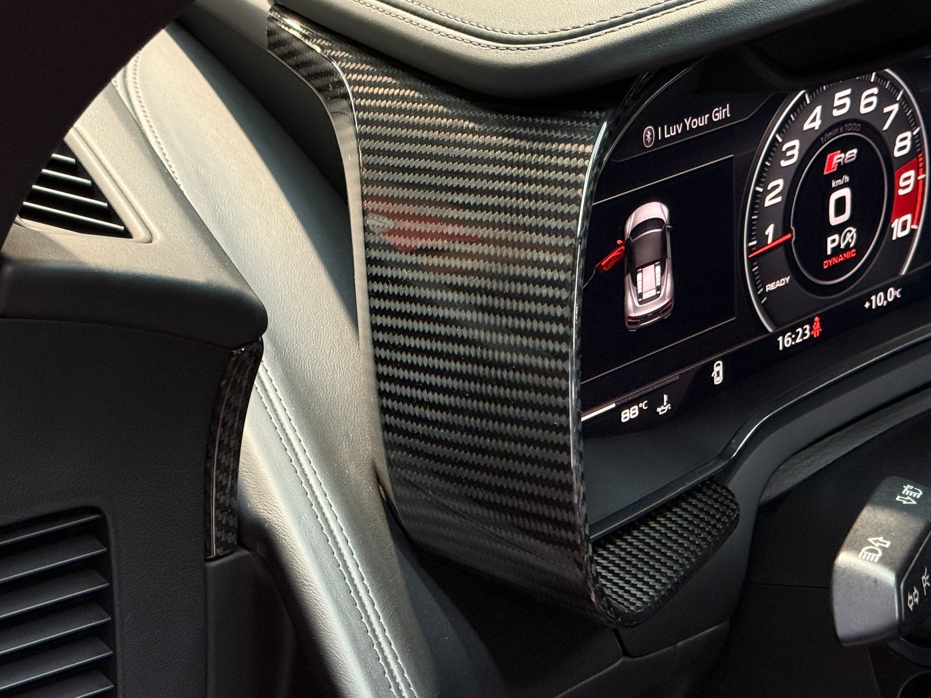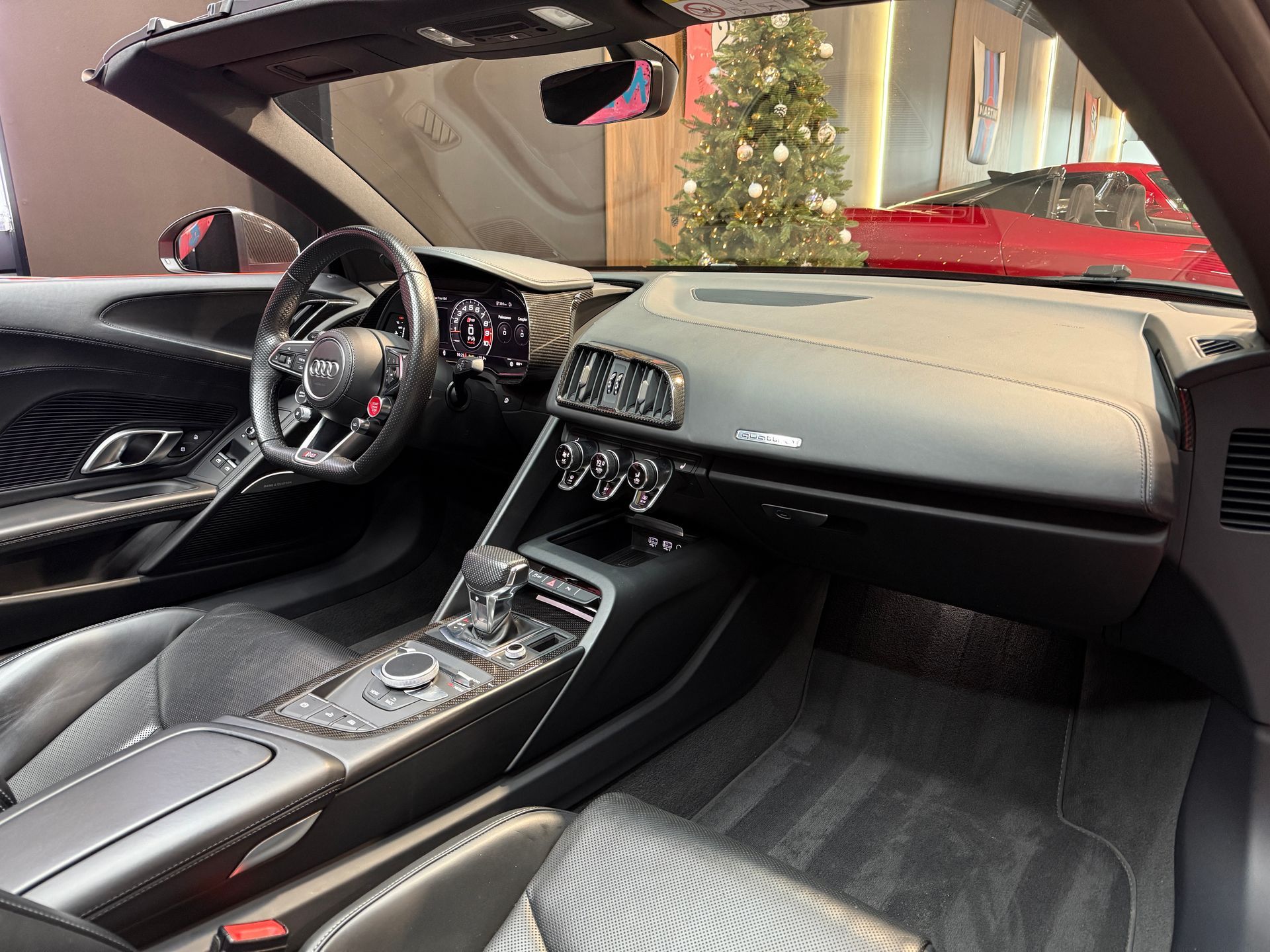 Notre exemplaire bénéficie d’une configuration particulièrement haut de gamme : freins céramique, pack extérieur carbone brillant Audi Exclusive, capot moteur carbone, phares LED avec éclairage laser, sièges baquet, Bang & Olufsen, échappement sport, et de nombreux éléments carbone intérieur. Une R8 Spyder très fortement optionnée, élégante et résolument sportive.