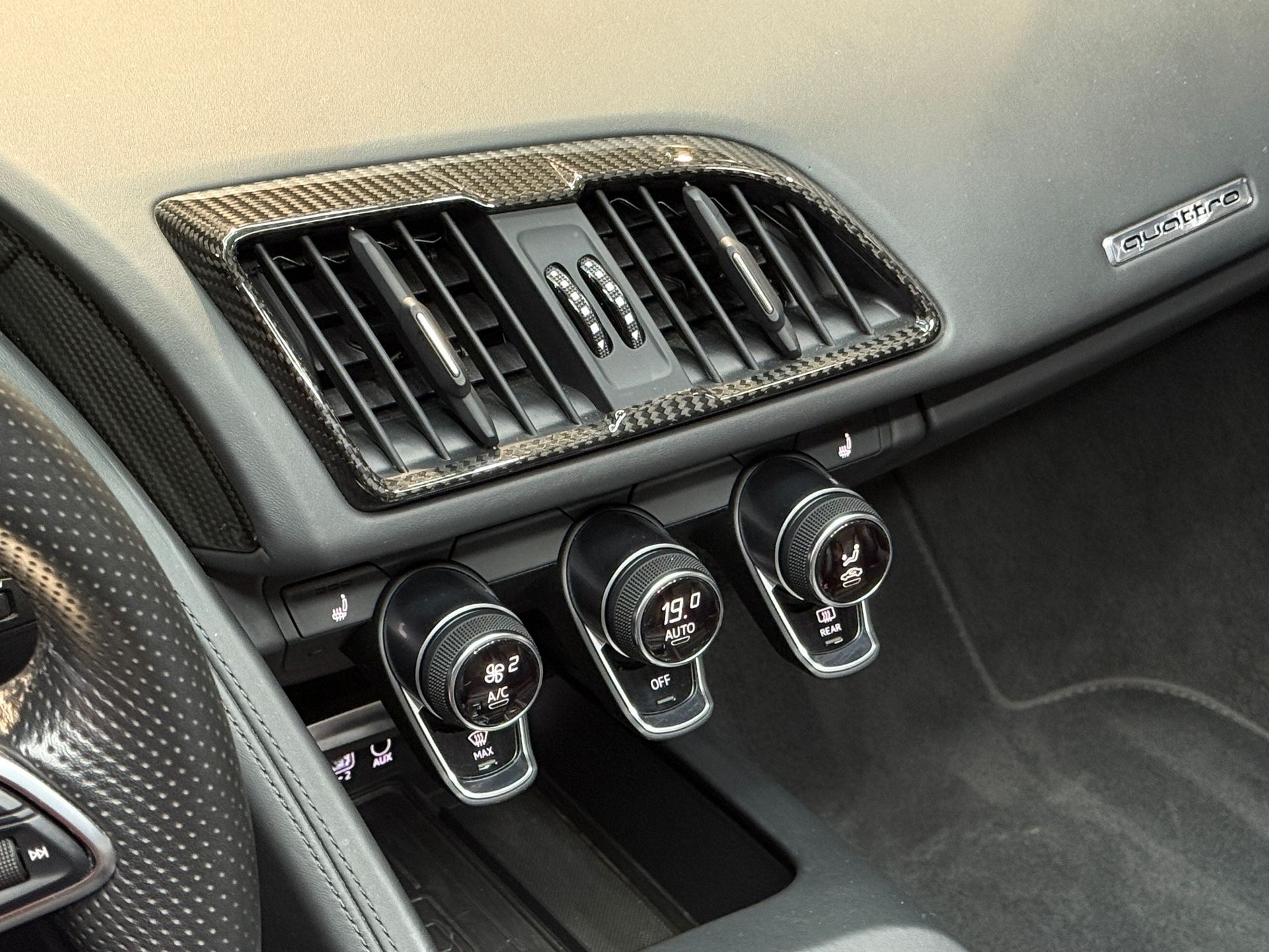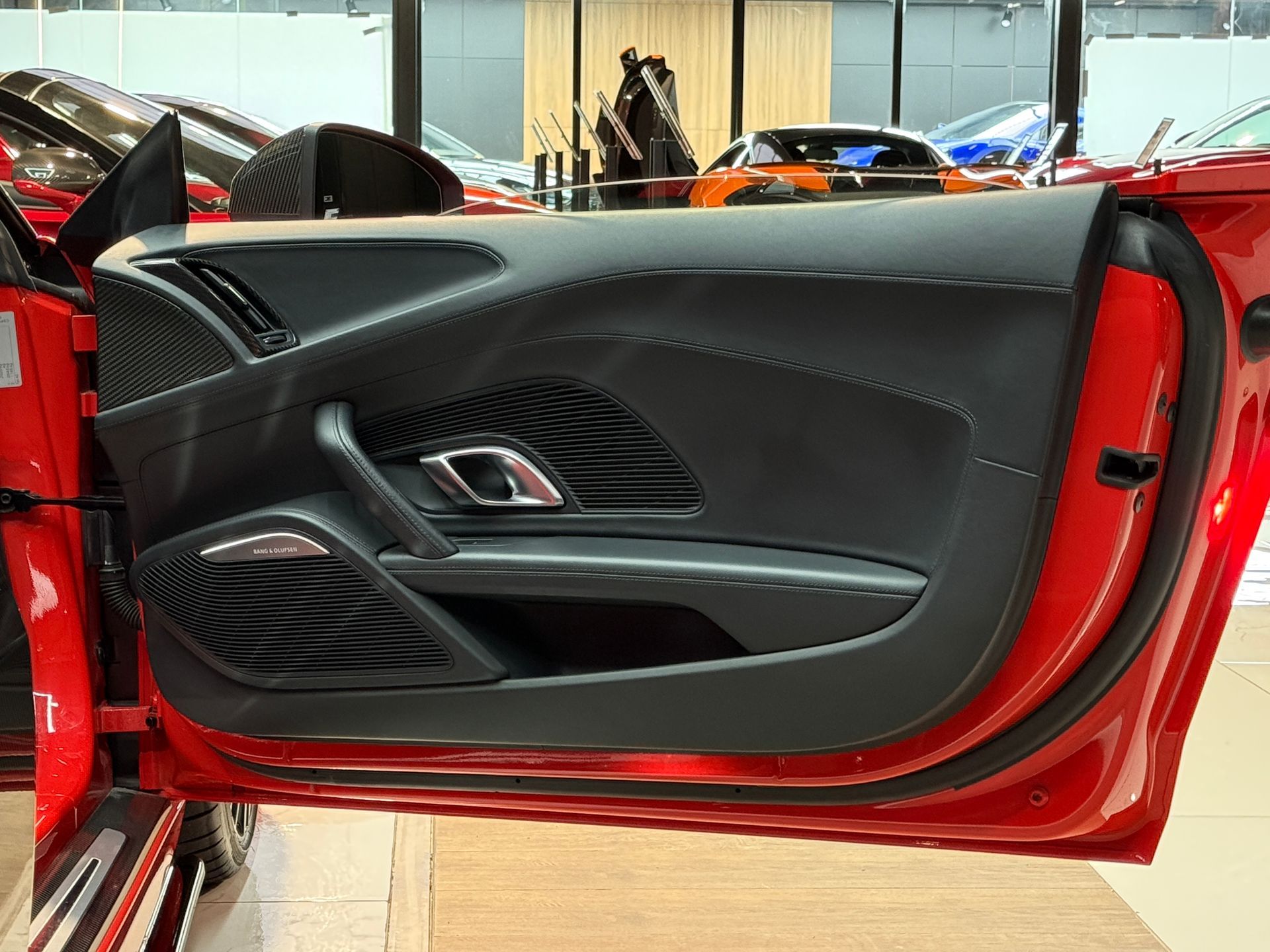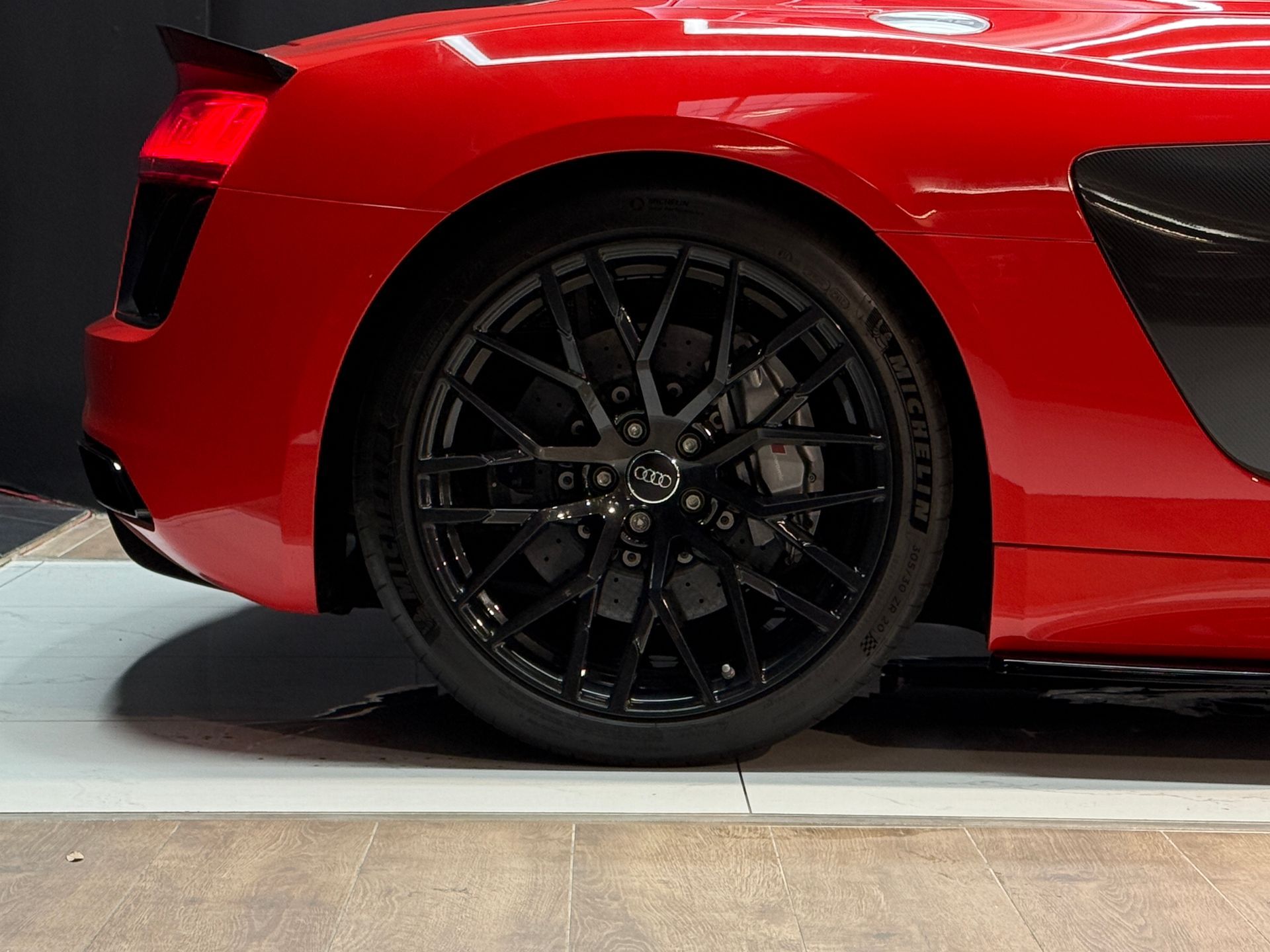 Notre exemplaire bénéficie d’une configuration particulièrement haut de gamme : freins céramique, pack extérieur carbone brillant Audi Exclusive, capot moteur carbone, phares LED avec éclairage laser, sièges baquet, Bang & Olufsen, échappement sport, et de nombreux éléments carbone intérieur. Une R8 Spyder très fortement optionnée, élégante et résolument sportive.