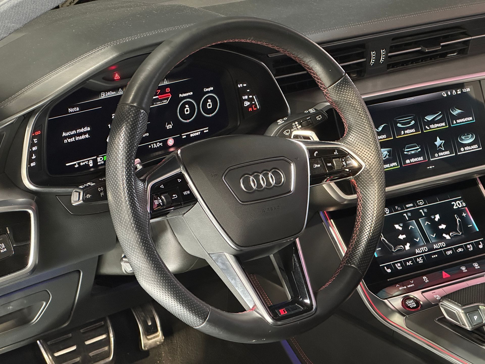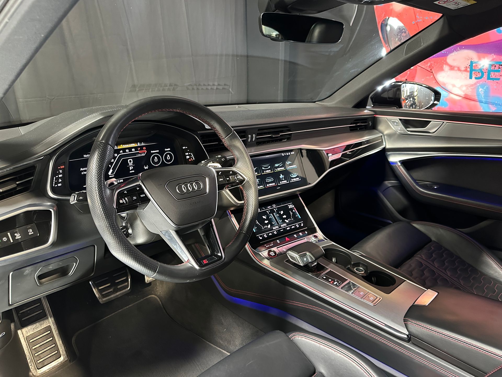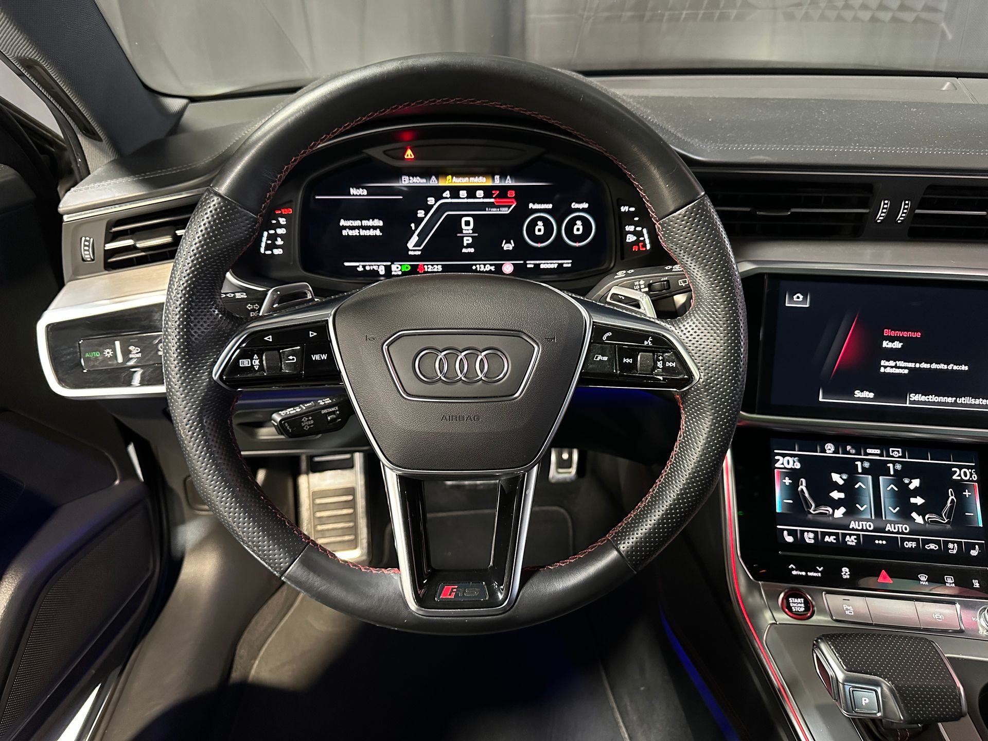 Notre exemplaire se distingue par une configuration exclusive comprenant le Pack Dynamique RS Plus, le châssis Sport RS Plus avec DRC, et l’échappement Sport RS. L’extérieur est sublimé par le Pack Esthétique Carbone, les jantes Audi Sport 22’’ finition noir anthracite poli, et les anneaux Audi noirs brillants.