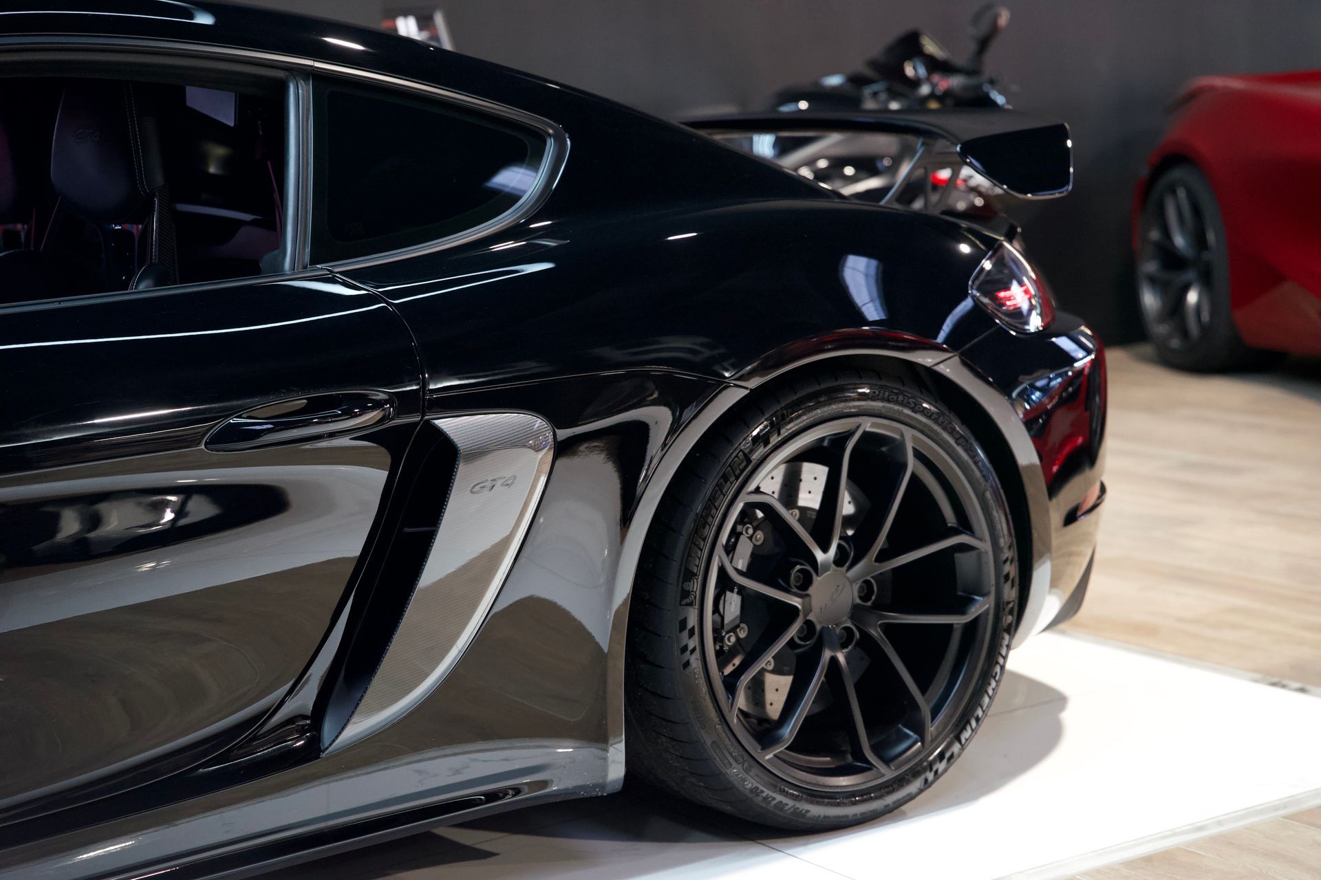 Entrées d'air latérales avec logo 'gt4' peint en couleur extérieure