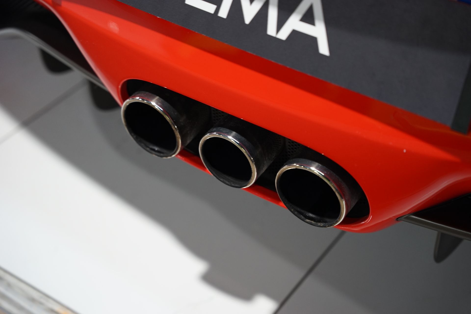 Notre exemplaire se distingue par une configuration sobre et sportive, sublimée par un covering Rosso Scuderia posé sur une teinte d’origine noire, offrant à la fois un impact visuel fort et une protection de la carrosserie.